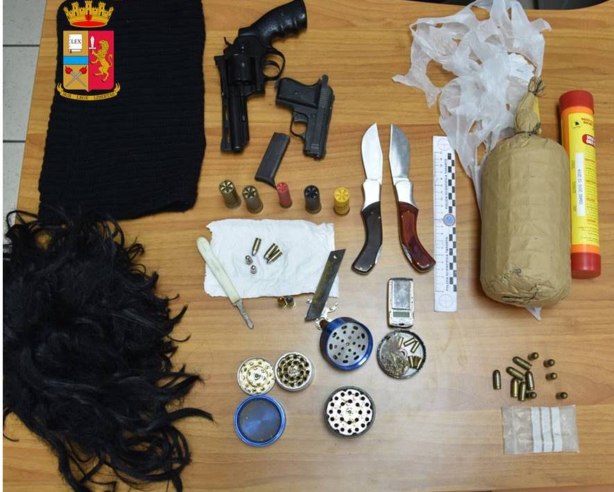 Nel corso della perquisizione all’interno di uno di questi depositi in uso ad un 27enne tarantino, i poliziotti hanno recuperato 2 pistole a salve prive del previsto tappo rosso, n.23 cartucce inesplose di vario calibro, 2 caschi da motociclista, una parrucca di colore nero ed uno scalda collo. Nel prosieguo dell’ispezione gli agenti hanno anche recuperato un manufatto esplosivo artigianale del peso di circa un chilo e mezzo ed un piccolo involucro trasparente contenente circa 10 grammi di semi di marijuana.
