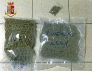 A seguito della perquisizione dell’automobile è stata rinvenuta, vicino al sedile anteriore del lato passeggero, una busta di colore blu con all’interno altre due buste termosaldate contenenti 970 grammi di sostanza stupefacente che è stata immediatamente sequestrata e, tramite narcotest, analizzata dalla Polizia Scientifica che l’ha identificata come marijuana.