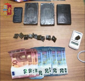Alla vista degli Agenti il CONFESSA, con mossa fulminea, ha tentato invano di disfarsi di una busta di cellophane lanciandola in un terrazzino attiguo all’abitazione, gesto quest’ultimo che non è sfuggito agli altri equipaggi che nel frattempo presidiavano esternamente l’edificio. All’interno della busta recuperata sono state rinvenute 3 panetti di hashish, 20 dosi della stessa sostanza, confezionate con il cellophane, un bilancino di precisione ed alcune lame di taglierino.