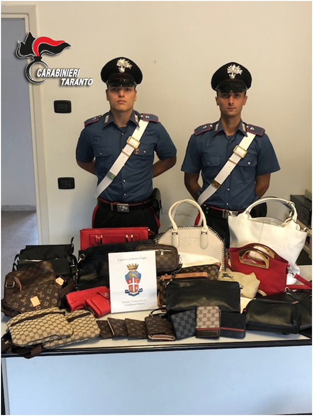 Durante i controlli i Carabinieri della Stazione Temporanea di Castellaneta Marina, hanno arrestato, in flagranza di reato, un 24enne, incensurato, senegalese, regolarmente presente sul territorio nazionale, in quanto ritenuto responsabile di resistenza a Pubblico Ufficiale, introduzione e commercio nello Stato di prodotti con segni contraffatti e ricettazione. I militari, nel corso del servizio notavano il 24enne aggirarsi sul lungomare cittadino con un borsone in spalla; per tali motivi, decidevano di procedere ad un controllo del soggetto il quale, dopo essere stato fermato, nel tentativo di guadagnare la fuga ed eludere il controllo, strattonava uno dei militari. Prontamente bloccato veniva sottoposto a perquisizione personale, all’esito della quale veniva trovato in possesso di numerosi accessori che occultava nel borsone, quali borse e portafogli, riportanti marchi di note griffes, risultati contraffatti.