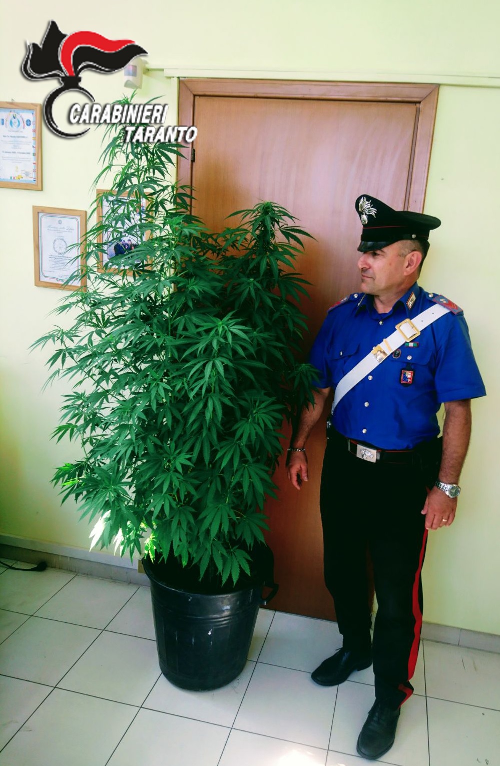 Fermato e sottoposto ad un controllo di polizia, finalizzato ad accertare che lo stesso non godeva di alcun permesso che lo autorizzava ad uscire di casa, l’uomo veniva tratto in arresto per il reato di evasione. Nel corso della successiva perquisizione domiciliare, i militari rinvenivano, all’interno della sua abitazione, una pianta di marijuana, alta circa 2 metri, con infiorescenza in corso, oltre che un pugnale da caccia ed un tirapugni, il tutto sottoposto a sequestro.