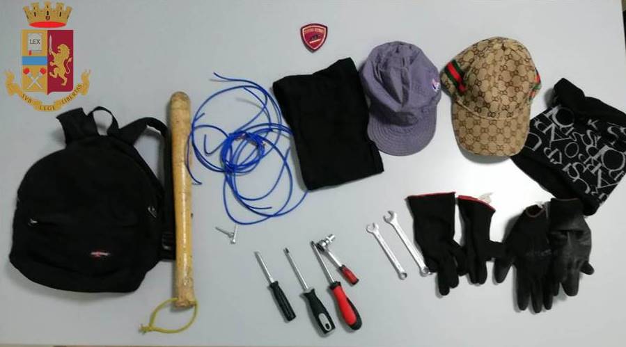 I successivi controlli hanno permesso di rinvenire all’interno dell’auto un vero e proprio “kit” del ladro di auto (spezzoni di fili elettrici, cacciaviti, una mazza di legno da baseball, chiavi inglesi, chiavi a cricchetto, viti a stella idonee a rompere i nottolini di auto).