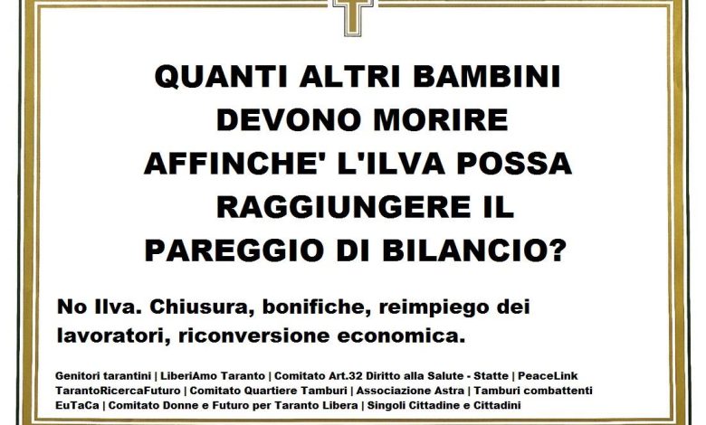 Con questo nuovo manifesto, si vuole richiamare il Governo centrale ad adottare misure a tutela della vita dei tarantini, con particolare riferimento ai bambini, sotto costante minaccia da ormai da troppi decenni, e in linea con i dettami della Costituzione italiana.