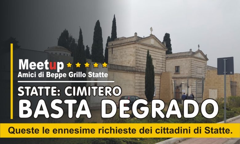 “Gli attivisti del meetup Amici di Beppe Grillo Statte tornano a contestare (dopo la segnalazione fatta ad aprile) lo stato di incuria e degrado nel cimitero di Statte e dichiarano che in data 16 Aprile 2018 hanno già segnalato la  situazione di degrado in cui versava il cimitero comunale. Niente da fare, a distanza di pochi mesi la situazione è  la stessa, forse ancor più grave. Alcuni cittadini, il quale si recano dai loro cari defunti in più giorni della settimana, dichiarano che il cimitero  sembra una cantina dove non si pulisce da circa dieci anni. Oltre alle erbaccia che non vengono rimosse, le  ragnatele, i locali wc inaccessibili per via della scarsa igiene e la sporcizia che sono sotto gli occhi di tutti. Ma lo stato in cui versa il cimitero sembra non interessare né l’Amministrazione comunale né chi di competenza.