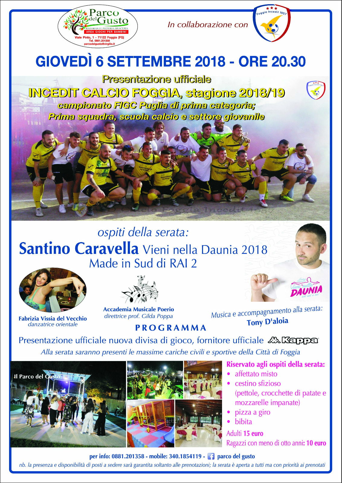 A rinforzare lo staff tecnico, da quest’anno inoltre il preparatore dei portieri Flavio Miglietta; annunciata la serata di presentazione ufficiale(in allegato la locandina) della società dauna, in calendario il 6 settembre alle ore 20:30 presso l’area eventi del ristorante il Parco Del Gusto di Foggia; prevista la presenza delle massime cariche istituzionali e sportive, nonché di ospiti musicali e appartenenti al mondo dello spettacolo; tra questi, va evidenziata quella di Santino Caravella, giovane attore comico foggiano che saluterà i presenti ed il giorno successivo, 7 Settembre alle ore 21 sarà protagonista, in via Lanza a Foggia, del suo spettacolo “Cittadino per un giorno”, evento inserito nel cartellone degli eventi estivi del capoluogo dauno.