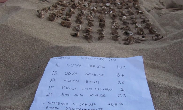 SAN PIETRO IN BEVAGNA – 87 uova schiuse naturalmente su 109 deposte, con 22 non schiuse, con una percentuale di schiusa pari al 79,8%. Questo il bilancio del nido di Specchiarica, seguito dai biologi e dai volontari dell’Oasi WWF di Policoro.