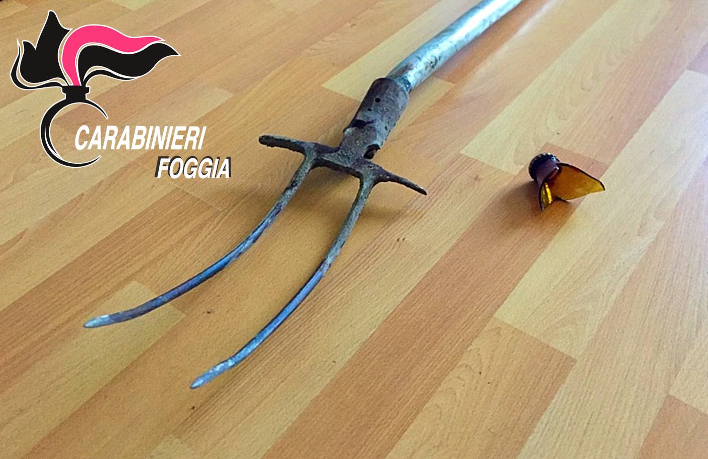 Nella notte di ieri la Centrale Operativa del Comando di Compagnia aveva inviato una pattuglia del Nucleo Operativo e Radiomobile impegnata nel servizio di perlustrazione del territorio di Manfredonia, in località Santa Tecchia, presso l’abitazione di G. I. C., soggetto già noto in quanto sottoposta alla misura cautelare degli arresti domiciliari. Giunti sul posto, i Carabinieri avevano trovato già sul posto due ambulanze, il cui personale stava soccorrendo alcune persone insanguinate. I Carabinieri avevano quindi iniziato immediatamente a sentire i vari feriti, tutti di nazionalità rumena, i quali avevano riferito di essere stati dapprima minacciati per futili motivi dal G. che, in evidente stato di alterazione, li aveva poi aggrediti anche con armi improprie, quali cocci di bottiglie di vetro e un forcone. Il G. è quindi stato prontamente immobilizzato dai Carabinieri. Gli uomini dell’Arma hanno poi repertato un coccio di bottiglia e un attrezzo agricolo di ferro, tipo forcone a due punte, ancora sporchi di sangue.