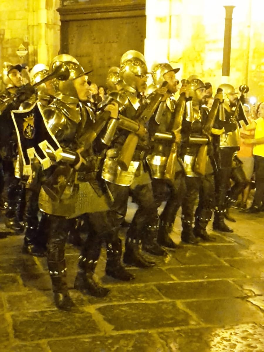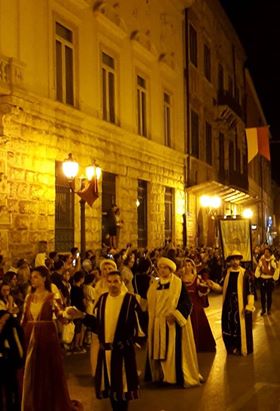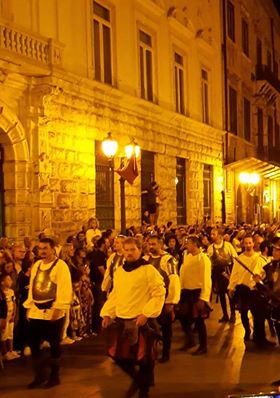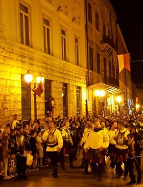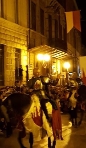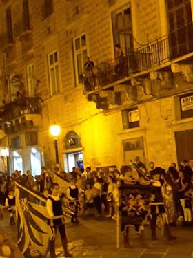 Dopo la messa in scena dell’offesa e del lancio del guanto di sfida, tenutasi venerdì 8 e il bando di sfida annunciato da araldi a cavallo sabato 9, l’evento clou è stato, come da tradizione, il corteo trionfale che si è snodato nella serata di ieri lungo le principali vie del centro storico cittadino, tra le quali Corso Garibaldi, Via Nazaret, Via Cialdini, ecc.. La manifestazione ha visto la partecipazione di vari gruppi storici barlettani con sbandieratori, giocolieri, mangiatori di fuoco, dame e cavalieri e altri gruppi provenienti dalla Campania, tra cui i 55 elementi degli Archibugieri Trombonieri Senatore di Cava de’ Tirreni, che hanno movimentato la serata con fragorosi spari di archibugio, un’antica arma da fuoco antenata del moderno fucile.