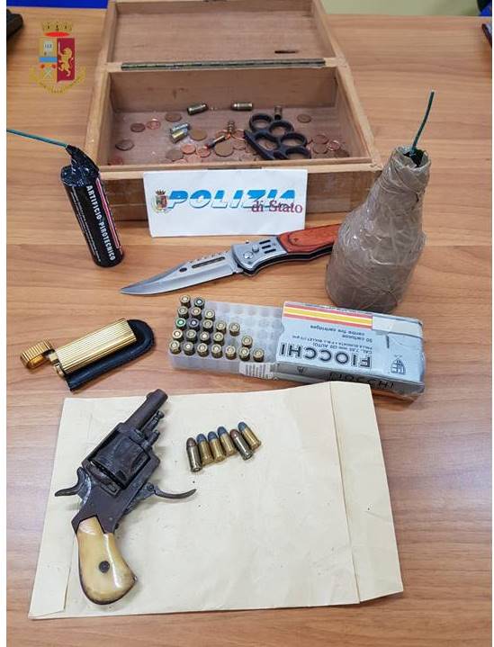 Nel prosieguo dell’attività, i poliziotti hanno anche rinvenuto sul davanzale della finestra del bagno, situato all’interno dell’esercizio commerciale, una pistola del tipo revolver, priva di matricola, caricata con sei cartucce, ed una scatola contenente altre 22 munizioni sempre dello stesso calibro. Inoltre, nel cassetto di un mobile è stato ritrovato un cofanetto in legno contenente cinque cartucce, due bossoli, un coltello a serramanico della lunghezza di cm 25, una “cazzottiera” in metallo, un accendino marca “Cartier” placcato in oro, un artifizio pirotecnico di 4°categoria ed un manufatto pirotecnico artigianale confezionato con nastro da imballaggio, munito di miccia, potenzialmente dannoso.
