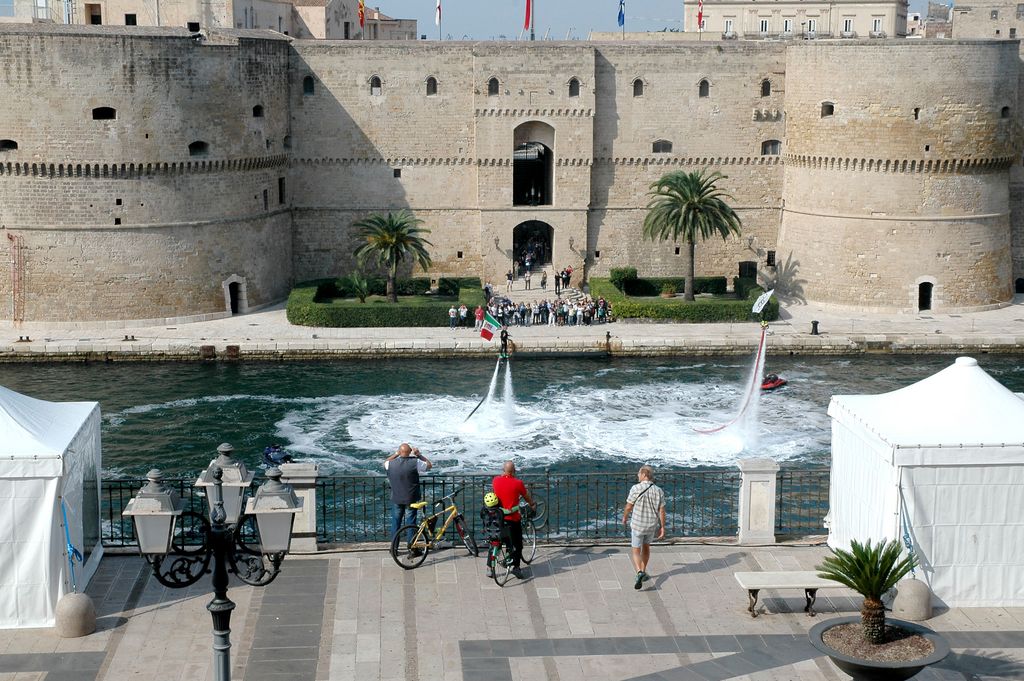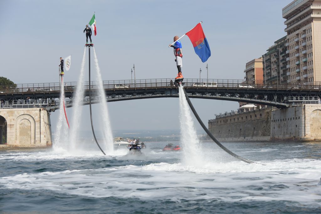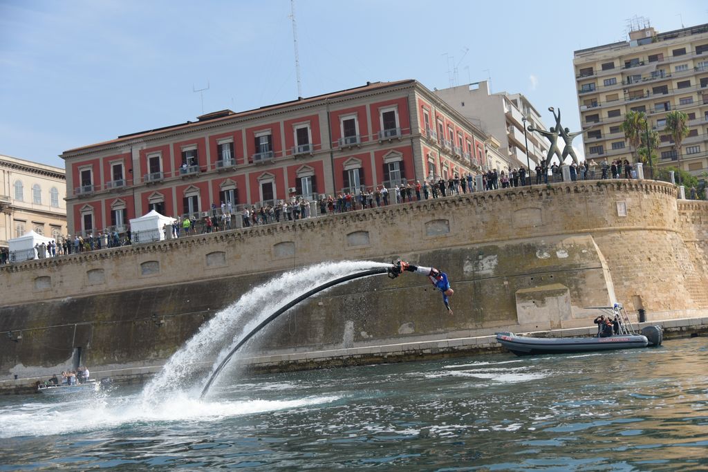 Ad unire idealmente e fisicamente i due Mari, Grande e Piccolo, teatri delle finali il canale navigabile testimone delle spettacolari esibizioni dei tre Flyboard (ASD Flyboard 2 Mari – ASD HYDROFLY Salento – ASD Taranto Flyboard) che hanno attraversato lo stesso quasi librandosi sulla superficie del mare sventolando le bandiere distintive degli Enti/Istituzioni organizzatori del trofeo del mare: Marina Militare, Comune di Taranto e CONI. Di seguito i vincitori delle finali in palio tra le ASD e i Circoli Velici: