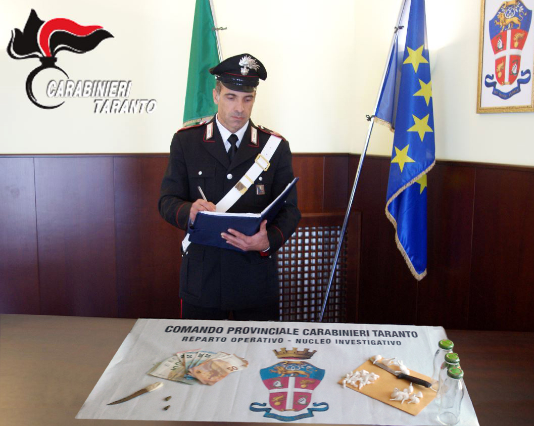 L’uomo, condotto in caserma, al termine delle formalità di rito, è stato denunciato, in stato di libertà all’A.G. tarantina, per detenzione ai fini di spaccio di sostanza stupefacente.