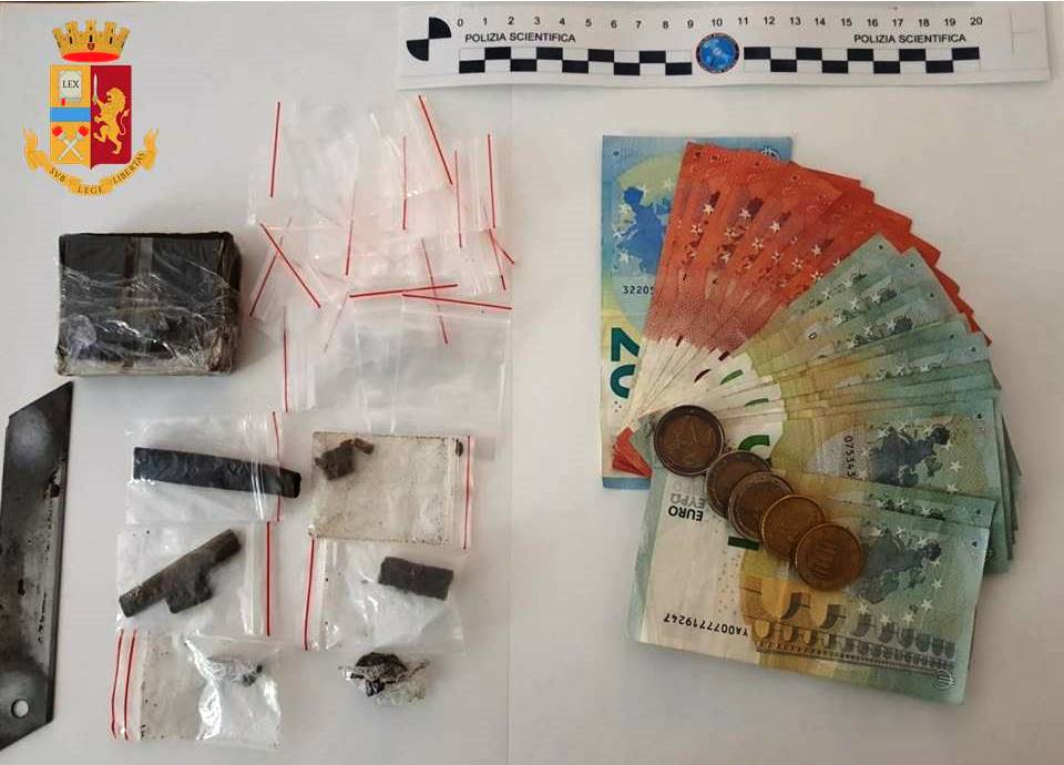 Dopo quanto ritrovato i poliziotti hanno deciso di estendere il controllo anche alla sua abitazione sita poco distante. Nel corso della perquisizione domiciliare, i Falchi hanno recuperato, su una mensola della camera da letto, un panetto di hashish del peso di 50 grammi, più altri quattro pezzi della stessa sostanza stupefacente del peso di cinque grammi, insieme a tutto il materiale necessario per il confezionamento della droga.