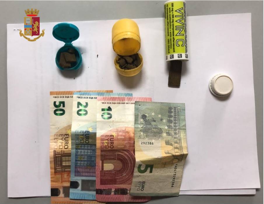 Da una prima perquisizione personale i poliziotti hanno recuperato nella tasca del pantalone indossato dal “pusher” un contenitore di plastica con tre tocchetti di hashish di varie dimensioni per circa due grammi .Altri quattro grammi della stessa sostanza stupefacente sono poi stati recuperati nascosti in una cassa che conteneva bottiglie di birra.