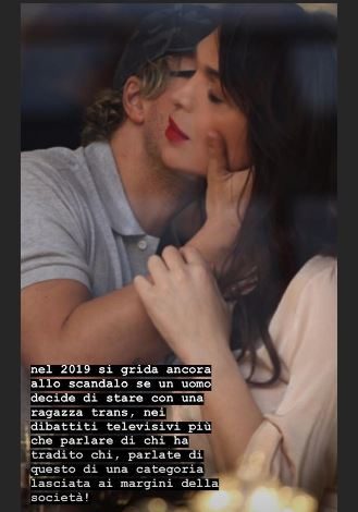 E’ la stessa conduttrice televisiva di una tv pugliese a staccarsi dal gossip e a rimettere i piedi per terra sbottando sulla propria pagina instagram: “Nel 2019 si grida ancora allo scandalo se un uomo decide di stare con una ragazza trann, nei dibattiti televisivi più che parlare di chi ha tradito chi, parlate di questo di una categoria lasciata ai margini della società” e poi : “sono una transessuale e non mi vergogno di esserlo! Vivo una vita come tutti…sogno una famiglia dei figli, sono un essere umano come voi!”