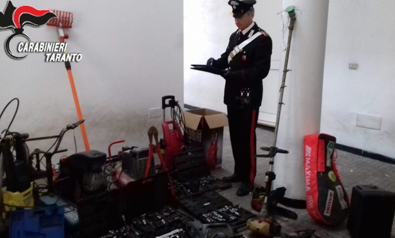 Nel corso delle successive perquisizioni domiciliari, presso le abitazioni degli arrestati, i Carabinieri rinvenivano a casa del 34enne diversa attrezzatura agricola tra cui decespugliatori, compressori, motoseghe, attrezzi vari sui quali sono stati avviati accertamenti finalizzati ad accertarne la provenienza. I tre soggetti, espletate le formalità di rito sono stati condotti presso la Casa Circondariale di Taranto a disposizione dell’Autorità Giudiziaria tarantina.