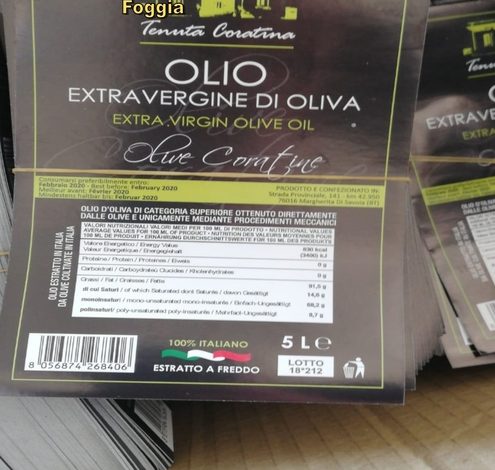 A Cerignola in provincia di Foggia sono state sequestrate oltre 2,5 tonnellate di olio extravergine d’oliva adulterato. La Guardia di Finanza di Foggia durante un servizio finalizzato a contrastare le frodi nell’industria e nel commercio, ha sequestrato uno stabilimento abusivo in cui centinaia di litri di olio di semi di origine sconosciuta venivano miscelati con altre sostanze (tra cui clorofilla) per essere imbottigliati e venduti come extravergine di oliva. Il responsabile dell’oleificio è stato denunciato a piede libero per vendita di prodotti industriali con segni mendaci. I finanzieri in bue box, privi di norme igieniche, hanno sequestrato oltre 2.500 litri di sostanza oleosa anche 30 chili di clorofilla e varie attrezzature industriali per la miscelazione, l’imbottigliamento ed il confezionamento del prodotto. Ed ancora 1.400 bottiglie in vetro ed oltre 11.000 etichette adesive utilizzate per confezionare il prodotto destinato al mercato del Nord Italia ed a quello tedesco.