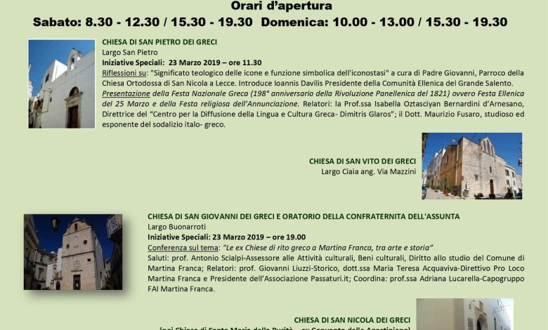 La scelta dell’itinerario delle ex Chiese di rito greco a Martina Franca, tra storia ed arte, proposto ai visitatori in occasione di queste giornate, è stata dettata dalla volontà sottolineare l’attività del FAI come ponte tra culture. Il progetto del FAI Nazionale è stato subito accolto dal GRUPPO FAI di Martina Franca-Delegazione di Taranto, dal prof. Antonio Scialpi, quale assessore alle Attività culturali, Beni culturali, Diritto allo studio del Comune di Martina Franca che patrocina l’evento. L’itinerario scelto si propone di amplificare e raccontare le diverse influenze culturali, anche straniere disseminate nei beni aperti in tutta la città, in quanto questi luoghi testimoniano la ricchezza derivata dall’incontro tra la nostra tradizione e quella greca. Tale fusione è sottolineata dalla partecipazione alle giornate FAI di primavera, in occasione della Festa Nazionale Greca del 25 Marzo, della Comunità Ellenica del Grande Salento di Taranto, Lecce e Brindisi, che ha ideato un programma di festeggiamenti coniugando attività presso luoghi e iniziative FAI, come quella di Martina Franca, con siti di culto ortodosso.