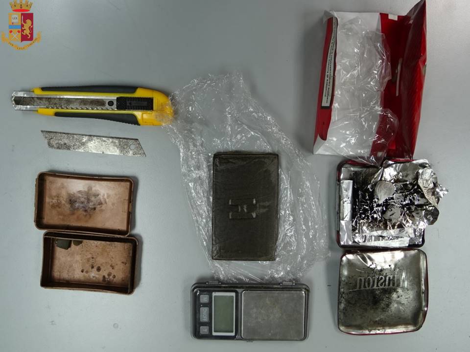 Da una prima perquisizione personale i poliziotti hanno recuperato nelle tasche del giubbotto due dosi di eroina contenute in una confezione metallica di sigarette, poco più di un grammo di hashish diviso in tre dosi già preconfezionate ed un panetto della stessa sostanza stupefacente, dal peso di circa 100 grammi. Il controllo è stato poi esteso anche al suo domicilio, dove i poliziotti hanno ritrovato un bilancino elettronico di precisione un taglierino con evidenti tracce di hashish e tutto il necessario per il suo confezionamento.
