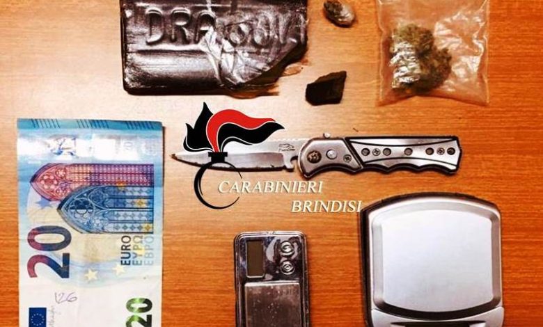 I Carabinieri della Stazione di Ceglie Messapica hanno tratto in arresto in flagranza di reato di detenzione al fine di spaccio di sostanza stupefacente P. G. 28enne del luogo. I militari nel corso di un servizio finalizzato alla prevenzione e repressione dello spaccio di stupefacente nella città, hanno anche effettuato una perquisizione personale e locale nell’ abitazione del giovane, dove nella camera da letto all’interno di una piccola scrivania, è stata rinvenuta una custodia per occhiali da sole con dentro un pezzo di hashish del peso di 84 grammi, avvolto in una pellicola trasparente di cellophane, due bilancini elettronici di precisione, un coltello a serramanico con la lama intrisa di stupefacente del tipo hashish, una bustina in plastica contenente 2 grammi di marijuana e ulteriori 3 grammi di hashish riposti in un pacchetto di sigarette, nonché alcuni semi di cannabis varietà indica e una banconota da 20€, il tutto sottoposto a sequestro. Le analisi speditive effettuate sullo stupefacente hanno dimostrato che effettivamente si tratta di hashish e marijuana. L’arrestato, al termine delle formalità di rito, su disposizione dell’Autorità Giudiziaria, è stato sottoposto alla misura cautelare degli arresti domiciliari nella sua abitazione.