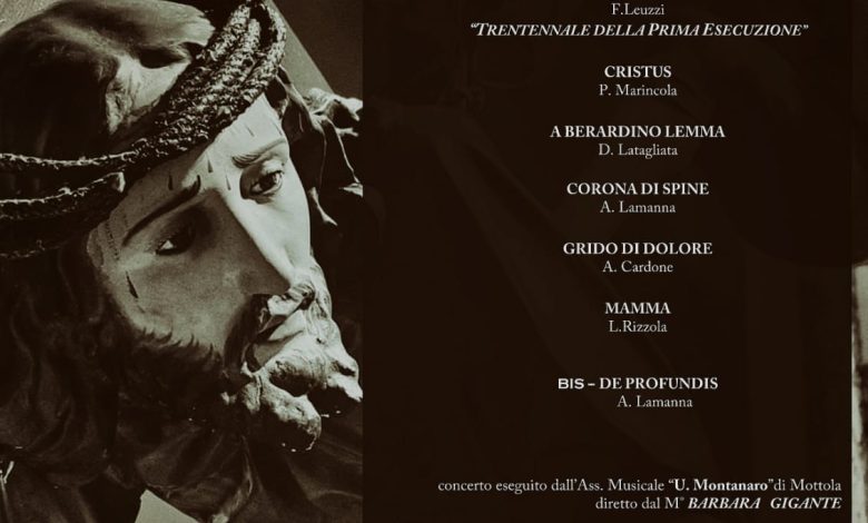 Si rinnova la sinergia tra la Confraternita guidata dal Priore Vito Greco e l’associazione musicale Umberto Montanaro-Città di Mottola, diretta dal M°Barbara Gigante. Il concerto prevede brani come “Tomba che chiudi in seno” del compianto maestro Franco Leuzzi, in occasione del trentennale della prima esecuzione, “Cristus” di P.Marincola, “A Berardino Lemma” di D.Latagliata, “Corona di spine” di A.Lamanna, “Grido di dolore” di A.Cardone, “Mamma” di L.Rizzola e il bis “De profundis”, sempre di Lamanna.