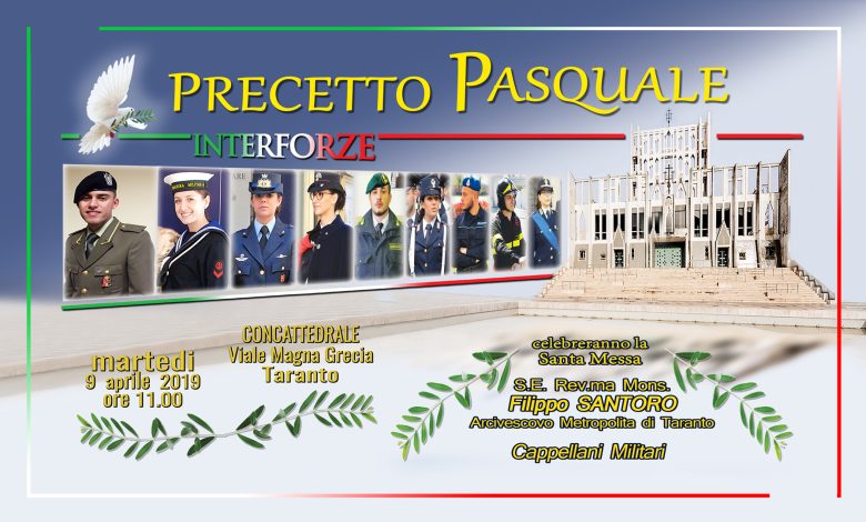 TARANTO – Il giorno 9 aprile alle ore 11.00, presso la Concattedrale Gran Madre di Dio di Taranto, sarà celebrato il Precetto Pasquale interforze a favore del personale di tutti i Comandi ed Enti del Presidio Militare di Taranto (Forze Armate, Corpi Armati dello Stato e Corpi Ausiliari dislocati nella provincia di Taranto), nonché dei relativi familiari.