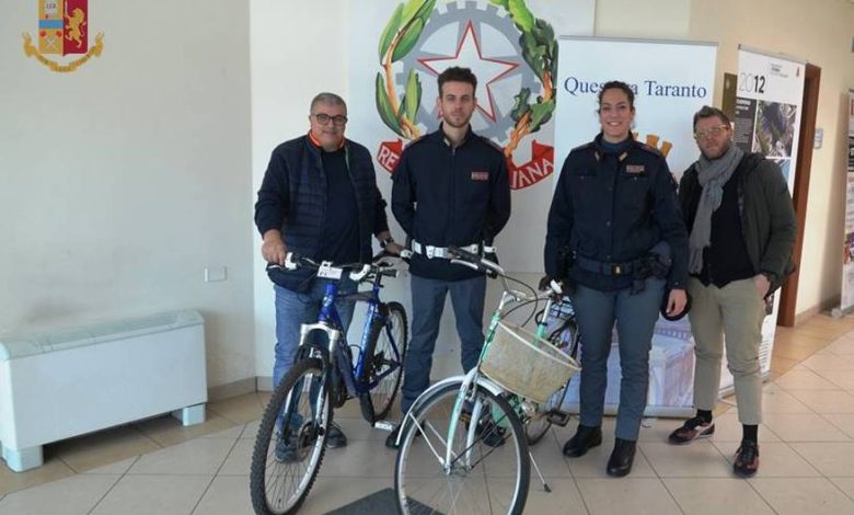 TARANTO – Ieri mattina negli Uffici della Questura sono state riconsegnate ai legittimi proprietari  due biciclette rubate lo scorso 5 marzo e poi recuperate dalla Squadra Volante.