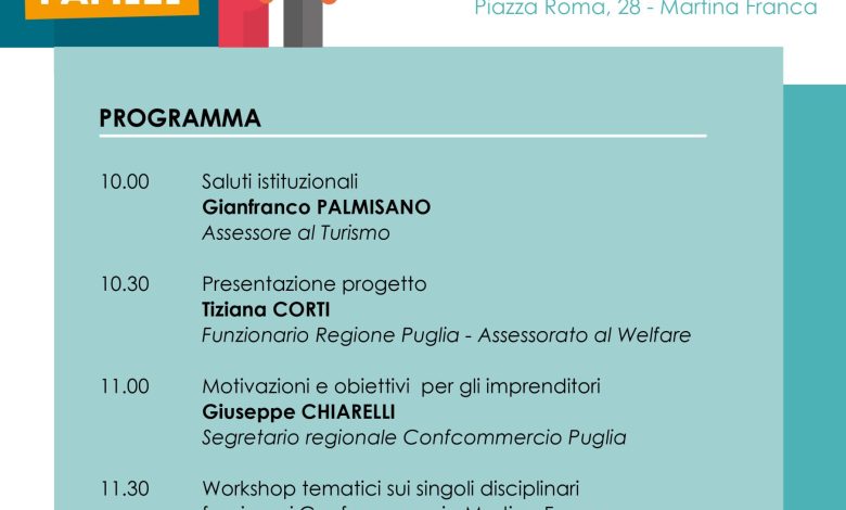 Interverranno Tiziana Corti, dell’Assessorato regionale al Welfare e referente regionale del Progetto P.L.F, Giuseppe Chiarelli, segretario generale Confcommercio Puglia, Vincenzo Leo, coordinatore del tavolo provinciale Confturismo. Aprirà l’incontro, per i saluti istituzionali, l’assessore al Turismo del Comune di Martina Franca, Gianfranco Palmisano. L’iniziativa è patrocinata dal Comune di Martina Franca. Il seminario si terrà a Palazzo Ducale (Sala degli Uccelli), con inizio alle ore 10.00.