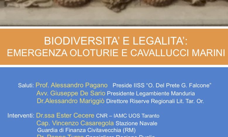 Sabato 25 maggio alle ore 10.00, presso l’Istituto di Istruzione Secondaria Superiore “Del Prete – Falcone” di Sava, si svolgerà un forum divulgativo sull’emergenza ambientale scaturita dall’eccessivo prelievo delle oloturie e dei cavallucci marini, destinati al mercato orientale.