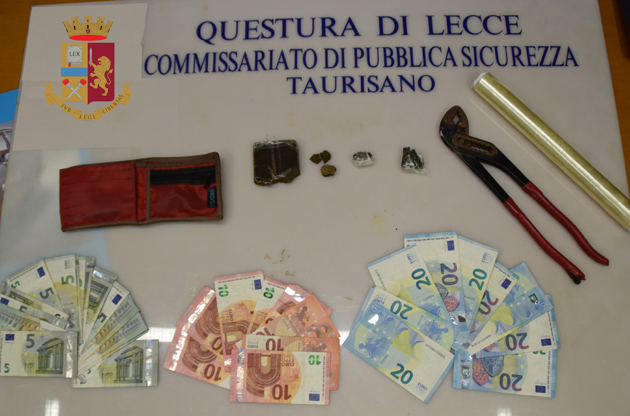 Taurisano (Le):  Gli Agenti della Squadra Volanti del Commissariato di P.S. hanno tratto in arresto D.B.L.E., di anni 49, di Taurisano, in flagranza di reato di detenzione ai fini di spaccio di sostante stupefacente di tipo hashish. Gli agenti nel corso di una attività d’indagine apprendevano che il predetto aveva avviato un’attività di spaccio di sostanze stupefacenti presso la sua abitazione. Lo hanno sottoposto a controllo mentre si apprestava ad uscire di casa, si dimostrava in evidente stato di agitazione e, vistosi alle strette, su richiesta degli agenti, spontaneamente consegnava due involucri contenenti sostanze stupefacenti tipo hashish che aveva occultato addosso. Il contenuto risultava essere pari ad un peso lordo di 16,3 grammi. A seguito della perquisizione domiciliare eseguita presso la sua abitazione veniva rinvenuta altra sostanza stupefacente: sul terrazzino della cucina aveva nr. 1 pezzo solido di hashish per un peso complessivo di gr. 58,9 occultato in una piantina ornamentale;  all’interno della cucina, venivano rinvenuti altri due involucri della stessa sostanza per un peso complessivo di gr. 4,5 ed una pinza a pappagallo, ancora unta di residui della sostanza stupefacente, che presumibilmente veniva utilizzata per il taglio del panetto di hashish. Sempre nella cucina è stato trovato un portafogli contenente la somma in denaro pari ad Euro 340,00, divise in banconote da 20, 10 e 5 euro, presumibilmente provento dell’attività illecita.Tutto quanto rinvenuto veniva sottoposto a sequestro. Il D.B.L.E., su disposizione della Procura della Repubblica di Lecce, è stato sottoposto in regime degli Arresti Domiciliari presso la propria abitazione in attesa del processo per direttissima.