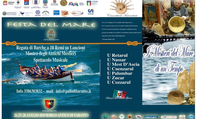 TARANTO – Il Palio di Taranto promuove l’edizione 2019 della “Festa del Mare” che si realizzerà nelle giornate del 26, 27 e 28 Luglio. Gli eventi saranno ad accesso libero e gratuito in una delle location più belle e suggestive della città, il Castello Aragonese, che venerdì 26 e sabato 27 ospiterà a partire dalle ore 18.00 presso il Ponte del Soccorso e Piazza D’Armi “I Mestieri di un Tempo”. Parteciperanno alla mostra “il Maestro d’Ascia”, “U Retarulo”, “U Nassaro”, “U Cuonz”, “U Seggiar” e il maestro Nicola Giudetti, che insieme illustreranno gli antichi mestieri legati al mare. Domenica 28 Luglio avrà luogo, a partire dalle ore 09.00 per tutto il giorno, “Il Palio del Mediterraneo” rivolto alle città a specchio nel Mediterraneo. La gara sarà ambientata nel Canale Navigabile e si svolgerà su lancioni a 10 remi con 10 vogatori ed un timoniere con voga all’inglese, articolandosi in due manche, una al mattino e l’altra il pomeriggio. Le marinerie partecipanti alla competizione di quest’anno sono quelle di Catania, Brindisi, Giovinazzo, Reggio Calabria, il Palio di Taranto e Vasto. Durante la giornata “Lo Studio Olistico e Yoga Sankalpa” presenterà diverse tecniche di massaggio a due e quattro mani, come il “Lomi Lomi Nui”, che sono state create imitando proprio il movimento delle onde del mare. Si avrà, inoltre, la possibilità di partecipare a delle visite gratuite degli ipogei nel Borgo Antico, grazie alla collaborazione con il comitato de “Il Pittaggio del Baglio.” Alle ore 21.00, dopo la premiazione degli equipaggi vincitori, il Castello Aragonese sarà sede della XXIV edizione de “La notte delle Chitarre” in collaborazione con l’Ateneo della Chitarra , in cui si esibirà il gruppo de “Le Sirene del Nilo”, promotrici della danza mediterranea. Si animerà così la stagione estiva della città di Taranto, dando il palco ad una manifestazione in cui tradizione, cultura, sport e turismo trovano espressione risaltando l’unicità della città dei due mari.