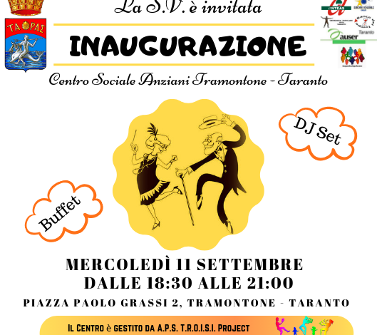 Siamo infatti convinti che “Insieme si può” e che Taranto abbia bisogno di maggiore coesione tra gli Enti del Terzo Settore», continua la Presidente. Sono partner del progetto Anteas, Auser, Banca del Tempo, Contro le Barriere, Cooperativa Esperia 2000, Europa Solidale, Zeus Università Popolare. Tra i corsi in partenza: danzamovimentoterapia (Liscio, balli popolari, balli di gruppo e serate danzanti) musicoterapia e canto, laboratori di ricamo, cucito creativo e uncinetto, arteterapia, ginnastica dolce, cineforum, teatro, scrittura della memoria, informatica, fotografia ecc.. L’obiettivo è quello di creare una comunità solidale e accogliente dove nessuno debba sentirsi escluso per garantire la riscoperta di se stessi anche quando si pensa di aver già scoperto tutto di sé. “Anziani in gioco” è lo slogan del progetto, e sintetizza l’idea che sarà alla base di tutte le attività: “anziani che si mettono in gioco per riscoprire una nuova età, una età che è ancora capace di stupire, divertire e coinvolgere.” «La T.R.O.I.S.I. Project è un’associazione estremamente vivace dal punto di vista dell’impegno sociale, per questo motivo, in un’ottica di solidarietà e coerenza alla mission, abbiamo scelto di offrire, per l’inaugurazione, un buffet preparato dalla Cooperativa Noi e Voi (i dolci sono prodotti nella pasticceria nata presso la Casa Circondariale di Taranto dai detenuti coinvolti nel percorso di recupero e reinserimento lavorativo) e di esporre i lavori della sartoria sociale “Harlequin” (Una sartoria dove i soggetti più deboli hanno la possibilità di imparare un mestiere antico, e reinserirsi nel mondo lavorativo attraverso la produzione di oggetti di cucito, riparazioni sartoriali e creazioni di abiti).»