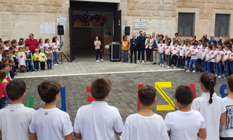 E’ una delle filastrocche scritte e recitate dai piccoli alunni dell’I.C. “G. Marconi” che così hanno voluto esprimere la loro gratitudine, nei confronti dell’Amministrazione Comunale, per l’avvenuta ristrutturazione di piazza Marconi. Sono stati proprio loro, gli studenti dello storico istituto scolastico martinese, i protagonisti della cerimonia di inaugurazione della piazza, svoltasi, al cospetto di una numerosa rappresentanza di genitori, alla presenza della Dirigente scolastica, dott.ssa Grazia Anna Monaco, del sindaco, Franco Ancona, del vicesindaco e assessore ai Lavori Pubblici, Gianfranco Palmisano, e di una significativa delegazione della stessa Amministrazione comunale, composta dagli assessori Antonio Scialpi (Diritto allo Studio), Tiziana Schiavone (Politiche Sociali), valentina Lenoci (Politiche giovanili) e da una rappresentanza di consiglieri. Ad aprire la cerimonia, sulle note dell’inno di Mameli, la sfilata degli alunni delle quinte, della Scuola Secondaria di Primo Grado e di una piccola rappresentanza della Scuola d’infanzia.