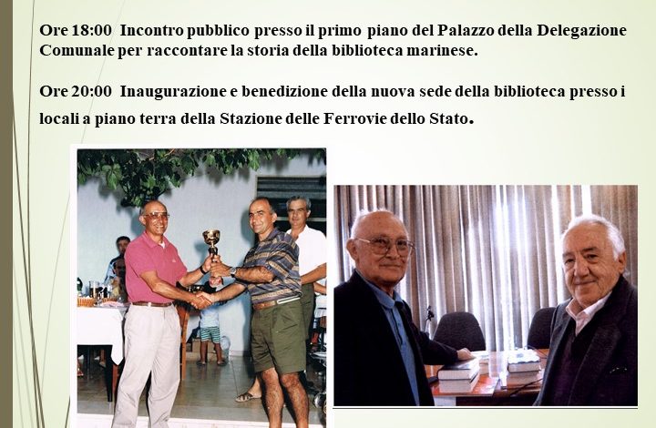 Alle ore 18, presso il Palazzo della Delegazione, si terrà un incontro pubblico in cui verrà narrata la storia della biblioteca civica marinese sin dalla sua nascita. Il merito della sua fondazione e della sua attività va ai cittadini Giulio Ranaldo, Giovanni Avarello e Fausto Toso.
