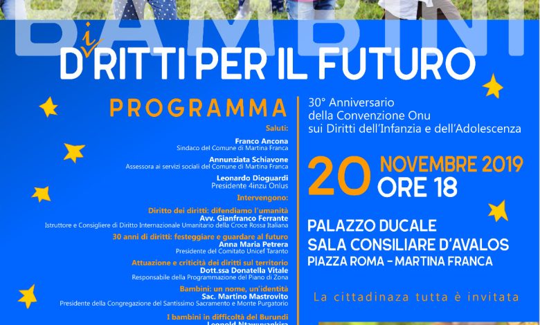 Si terrà a Martina Franca il 20 novembre 2019, con inizio alle 18.00 presso la “Sala Consiliare D’Avalos” di Palazzo Ducale (Piazza Roma) il convegno dal titolo “Bambini D(i)ritti per il futuro”.