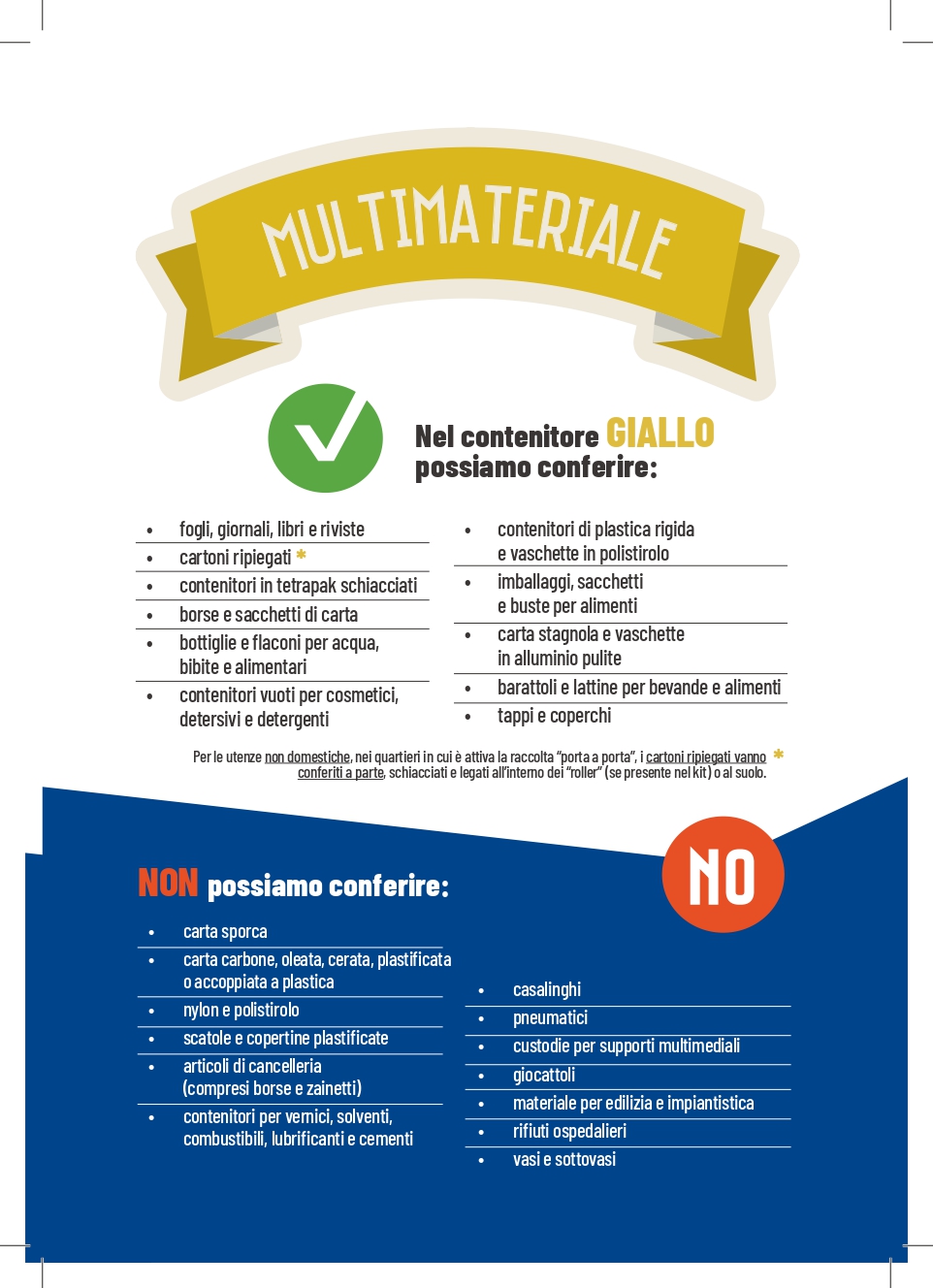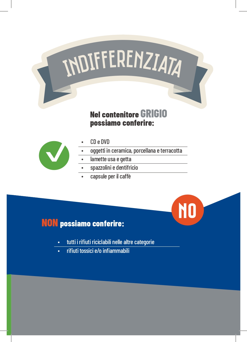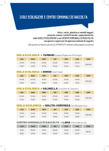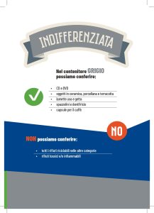 Quali saranno le modalità di conferimento? L’organico (contenitore marrone) sarà raccolto 3 volte a settimana (4 nelle utenze non domestiche), mentre l’indifferenziato (contenitore grigio) 2 volte. Carta, plastica e metallo finiranno in un unico contenitore, il giallo, e saranno raccolti 1 volta a settimana (le utenze non domestiche avranno 2 turni settimanali aggiuntivi per la raccolta del solo cartone). Chiude il vetro, che sarà raccolto ovunque 1 volta ogni 2 settimane.