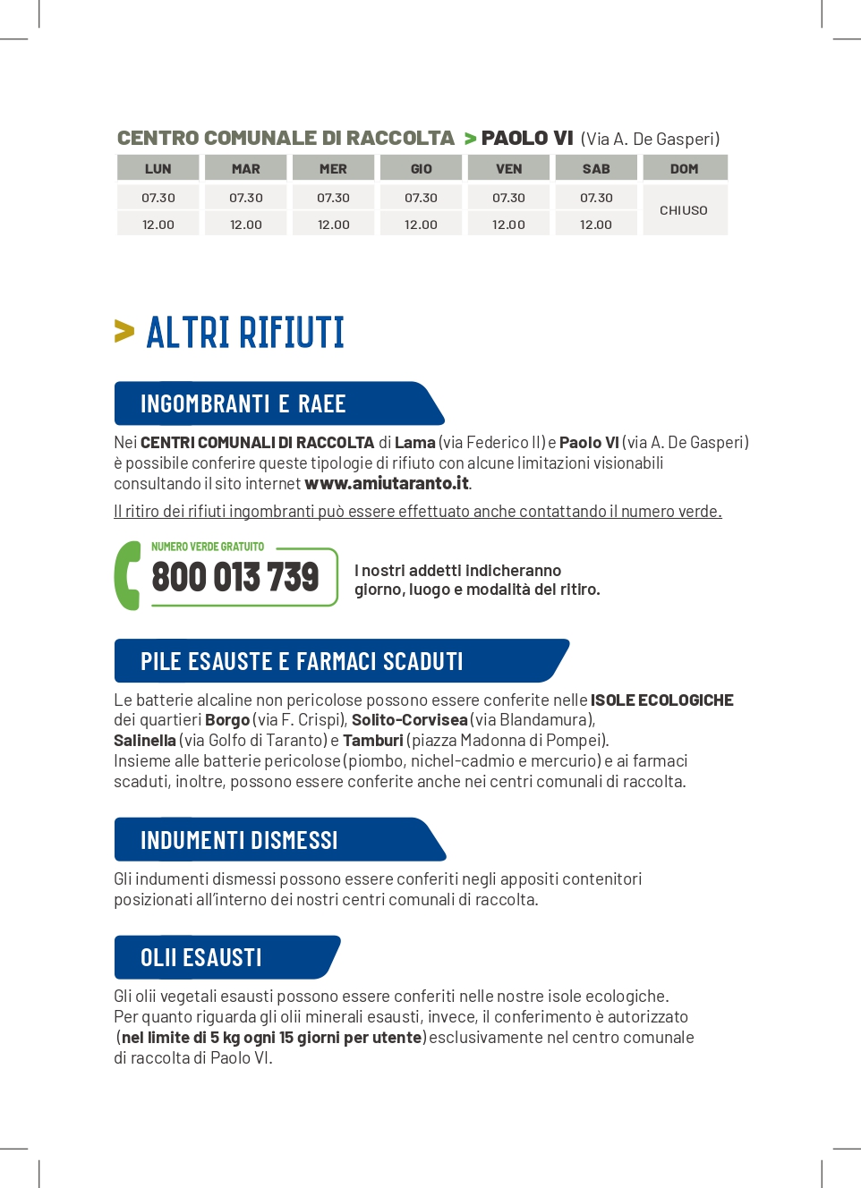 Rispetto alle previsioni, i quartieri obiettivo dello start up del servizio sono cambiati. Dopo l’avvio del “porta a porta” a Tamburi, Lido Azzurro e Paolo VI e la rimodulazione di Talsano, Lama e San Vito, sarà la volta di Borgo e Città Vecchia con l’installazione delle micro isole ecologiche con i cassonetti ingegnerizzati. «Per l’azienda è la prova di una rinnovata capacita a operare nell’interesse dell’utenza – ha spiegato il presidente di “Kyma Ambiente – Amiu Carloalberto Giusti –, che ci vedrà al suo fianco per accompagnare questo vero e proprio cambiamento. Per questo lanceremo anche una fitta campagna di comunicazione che abbiamo intitolato “A Raccolta”, una chiara chiamata all’azione che visivamente individua il suo oggetto: i rifiuti. Affissioni, social, un sito internet dedicato (araccolta.it), pubblicità su giornali, radio, tv e web, incontri nei quartieri, eventi di sensibilizzazione e, imprescindibile, una serie di “faccia a faccia” con gli alunni delle scuole cittadine sono le tappe di questo percorso che è già partito».