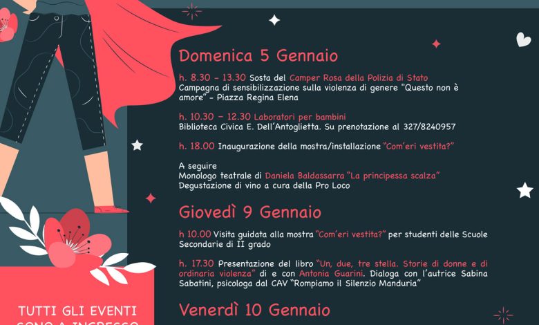 La rassegna verrà inaugurata domenica 5 gennaio 2020, alle ore 18.00, presso la Sala Convegni del Palazzo Marchesale con la mostra/installazione “Com’eri vestita?” che mira a destrutturare i pregiudizi e gli stereotipi che colpevolizzano le donne vittime di stupri. La mostra, nata all’interno dell’Università del Kansas, e riadattata da Libere Sinergie di Milano, giunge in Puglia attraverso il lavoro di Sud Est Donne: 17 abiti che riproducono quelli realmente indossati al momento della violenza che gridano, con tutto il loro carico emotivo, che la colpa non è mai della vittima, ma sempre dell’uomo violento.