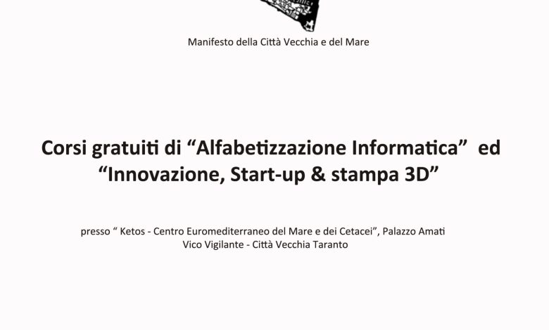 Il corso proposto “Innovazione, start-up e stampa in 3 D”, che partirà il 29 Febbraio, è finalizzato,  infatti, a fornire ai discenti gli strumenti per comprendere tipologie, dinamiche e impatti dell’innovazione, le conoscenze di base per trasformare un’idea di business in un progetto di start up, e alcuni degli strumenti finanziari a sostegno dell’innovazione e delle start-up. Il corso di alfabetizzazione informatica, che inizierà il 28 Febbraio, è rivolto, invece, a coloro che non hanno dimestichezza con il mondo informatico e vogliono imparare a conoscere il computer, il web e le principali applicazioni dell’office automation. I corsi hanno l’obiettivo di svilupparsi con continuità nel tempo ed avranno per protagonisti giovani provenienti da aree degradate del territorio con età compresa tra i 16 e 30 anni; il progetto presentato è frutto della collaborazione tra più soggetti pubblici o privati e contiene elementi di spiccata originalità per i contenuti, la modalità di gestione dell’evento, le modalità di coinvolgimento del pubblico e di nuovi pubblici, la gestione del marketing.