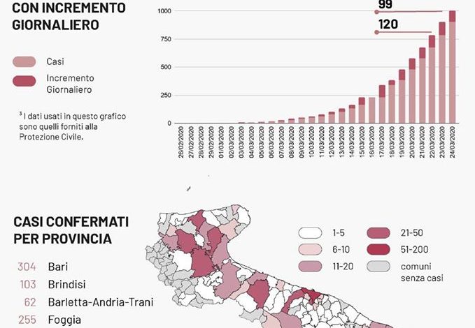 All’ultimo aggiornamento, del 24 marzo – in Puglia sono stati effettuati 584 tamponi per l’infezione covid-19. 99 i casi positivi: 36 in provincia di Bari, 3 in provincia di Bat, 1 in provincia di Brindisi, 29 in provincia di Foggia, 12 in provincia di Lecce, 5 in provincia di Taranto, 13 casi di cui è in corso l’attribuzione della relativa provincia. Nella giornata di ieri sono stati registrati 7 decessi: 3 in provincia di Bari, 3 in provincia di Foggia e uno in provincia di Lecce.
