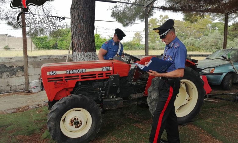 CASTELLANETA – Nella nottata di ieri, i Carabinieri del Nucleo Operativo e Radiomobile di Castellaneta e della Stazione di Marina di Ginosa, nel corso di un predisposto servizio finalizzato alla prevenzione e alla repressione delle attività criminali nel mondo rurale, hanno eseguito un fermo di indiziato di delitto nei confronti di un 32enne incensurato del posto, ritenuto responsabile di ricettazione e riciclaggio. I Carabinieri, impegnati in indagini connesse con furti di mezzi ed attrezzature agricole commessi in zona, sono intervenuti presso la casa rurale del prevenuto in località “Terzo Dieci”, agro del comune di Castellaneta, dove, a seguito di perquisizione locale, hanno rinvenuto due trattori agricoli, di cui uno in fase di ripunzonatura, due atomizzatori, due tagliaerba, due saldatrici, due compressori, dieci barattoli di fitofarmaci, un trapano e numerosi altri attrezzi agricoli risultati oggetto di furto in danno di aziende agricole ed agricoltori di Castellaneta e Ginosa. I mezzi ed il materiale rinvenuto, del valore di circa 70.000,00 euro, sono in fase di restituzione ai legittimi proprietari. La persona fermata è stata associata alla Casa Circondariale di Taranto come disposto dall’Autorità Giudiziaria jonica.