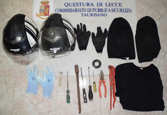 Taurisano (LE): Nella mattinata odierna gli agenti del Commissariato di P.S. di Taurisano, hanno tratto in arresto P.  E., di anni 32, noto pregiudicato di Taurisano, per i reati di resistenza a pubblico ufficiale, porto abusivo di arnesi atti allo scasso e ricettazione. Durante un normale servizio di controllo del territorio nella località di Ugento, gli operatori della volante notavano un motociclo Piaggio Beverly, con due persone a bordo e con indosso il casco, stazionavano con il motore acceso davanti un tabacchino in via Marina. Tale atteggiamento hanno insospettito gli operanti che intimavano gli occupanti del veicolo a scendere per un controllo. Alla vista degli agenti, i due si sono dati ad una precipitosa fuga nel pieno traffico cittadino. L’inseguimento non è terminato nemmeno quando i centauri, dopo aver messo a rischio l’incolumità dei cittadini con manovre pericolose, perdevano il controllo attraversando una pozzanghera. Determinati, dopo la caduta si sono rialzati per continuare a piedi la loro fuga, dividendosi per fuggire in due direzioni diverse. Gli agenti sono comunque riusciti a bloccare uno dei fuggitivi, che nell’estremo tentativo di evitare l’arresto, ha opposto una ferma resistenza, dimenandosi e spintonando gli agenti. Al termine delle attività d’indagine, il motociclo, risultato rubato un anno fa a Torre San Giovanni, nascondeva al suo interno un passamontagna e strumenti da scasso, tra cui diversi cacciaviti, una chiave inglese ed un “piede di porco”. La motociclo veniva restituito al legittimo proprietario, mentre il giovane veniva dichiarato in stato arresto per i reati di resistenza a pubblico ufficiale, porto abusivo di arnesi atti allo scasso e ricettazione e, su disposizione del P.M. di turno, sottoposto alla misura degli arresti domiciliari, in attesa del giudizio per direttissima fissato per domani.