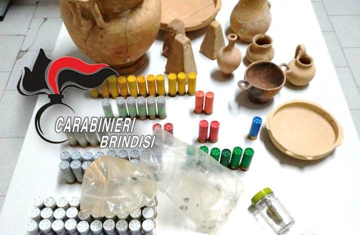 Mesagne (BR): I Carabinieri della Stazione di Mesagne, a conclusione degli accertamenti, hanno denunciato in stato di libertà, per detenzione abusiva di munizioni e ricettazione (in relazione all’impossessamento di beni culturali appartenenti allo stato) e segnalato all’Autorità Amministrativa per detenzione per uso personale di sostanze stupefacenti, un 49enne del luogo, in atto sottoposto agli arresti domiciliari. In particolare, nell’ambito di un servizio di controllo ai soggetti sottoposti agli arresti domiciliari, presso l’abitazione dell’uomo i militari operanti hanno rinvenuto e sequestrato 128 cartucce per fucile di diverso calibro, 11 reperti archeologici di vario tipo, risalenti presumibilmente ad epoca messapica (per i quali sono in corso specifici accertamenti) e 14,8 grammi complessivi di sostanza stupefacente di tipo marijuana, occultati in parte nella tasca dei pantaloni e in parte rinvenuta sul tavolo della cucina, il tutto sottoposto a sequestro.