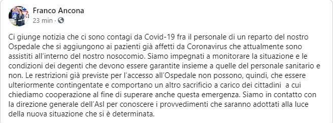 Ci giunge notizia che ci sono contagi da Covid-19 fra il personale di un reparto del nostro Ospedale che si aggiungono ai pazienti già affetti da Coronavirus che attualmente sono assistiti all’interno del nostro nosocomio. Siamo impegnati a monitorare la situazione e le condizioni dei degenti che devono essere garantite insieme a quelle del personale sanitario e non. Le restrizioni già previste per l’accesso all’Ospedale non possono, quindi, che essere ulteriormente contingentate e comportano un altro sacrificio a carico dei cittadini a cui chiediamo cooperazione al fine di superare anche questa emergenza. Siamo in contatto con la direzione generale dell’Asl per conoscere i provvedimenti che saranno adottati alla luce della nuova situazione che si è determinata.