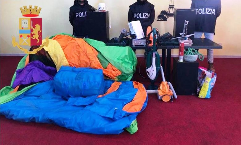 I Falchi della Squadra Mobile da qualche giorno avevano avviato mirate indagini per individuare i responsabili di alcuni furti avvenuti la scorsa settimana nella zona compresa tra Talsano, Lama e Taranto, due dei quali in danno di esercizi commerciali. Fondamentale impulso alla loro attività investigativa è stato dato dall’arresto di tre giovani sorpresi la notte del 25 novembre scorso dal personale delle Volanti a forzare un distributore automatico nei pressi di una farmacia a pochi metri della sede della Questura. Su uno degli arrestati, pluripregiudicato 28enne, già noto per i suoi numerosi e specifici reati contro il patrimonio, sono maturati i sospetti che potesse essere l’autore, insieme a due suoi complici, dei furti commessi degli ultimi giorni. I Falchi hanno deciso così di procedere ad una perquisizione domiciliare in casa del sospettato, una villetta nel comune di Leporano nella quale convive con i suoi genitori. Il controllo inizialmente non ha dato gli effetti sperati, ma la successiva ed approfondita ispezione dei luoghi ha permesso di scoprire, nel piazzale antistante la villetta, ben nascosta sotto un telone azzurro, un’ingente refurtiva, gran parte della quale rubata qualche giorno prima in una sala feste nella zona di Lama. Tra la refurtiva recuperata anche delle grosse casse acustiche, un amplificatore, un proiettore e due grossi scivoli gonfiabili. Il 28enne, già agli arresti domiciliari, è stato denunciato anche per ricettazione.