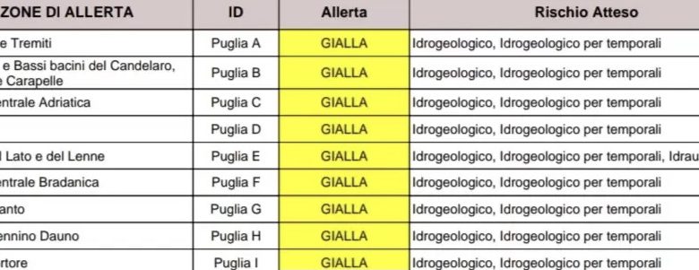 Il primo, con validità fino alle ore 20, fa riferimento a “precipitazioni: sparse, anche a carattere di rovescio o temporale, con quantitativi cumulati generalmente moderati, con fenomeni più persistenti su Puglia meridionale.” Rischio: secondo lo schema, fonte protezione civile della Puglia.