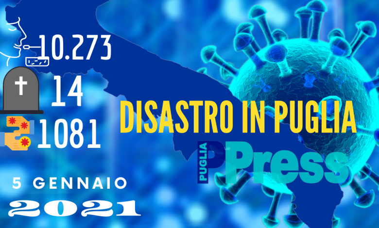 Il presidente della Regione Puglia, Michele Emiliano sulla base delle informazioni del direttore del dipartimento Promozione della Salute Vito Montanaro, informa che oggi martedì 5 gennaio 2021 in Puglia, sono stati registrati 10273 test per l’infezione da Covid-19 coronavirus e sono stati registrati 1.081 casi positivi: 386 in provincia di Bari, 88 in provincia di Brindisi, 172 nella provincia BAT, 109 in provincia di Foggia, 111 in provincia di Lecce, 211 in provincia di Taranto, 9 residenti fuori regione. 5 casi di provincia di residenza non nota sono stati riclassificati ed attribuiti.