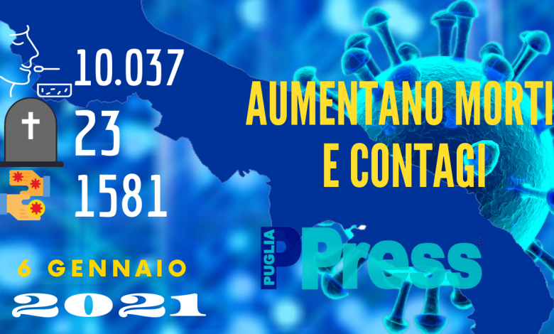 Sono stati registrati 23 decessi: 11 in provincia di Bari, 1 in provincia di Brindisi, 6 in provincia di Foggia, 1 in provincia di Lecce, 5 in provincia di Taranto. Un decesso di un residente in provincia Bat precedentemente registrato è stato riattribuito.