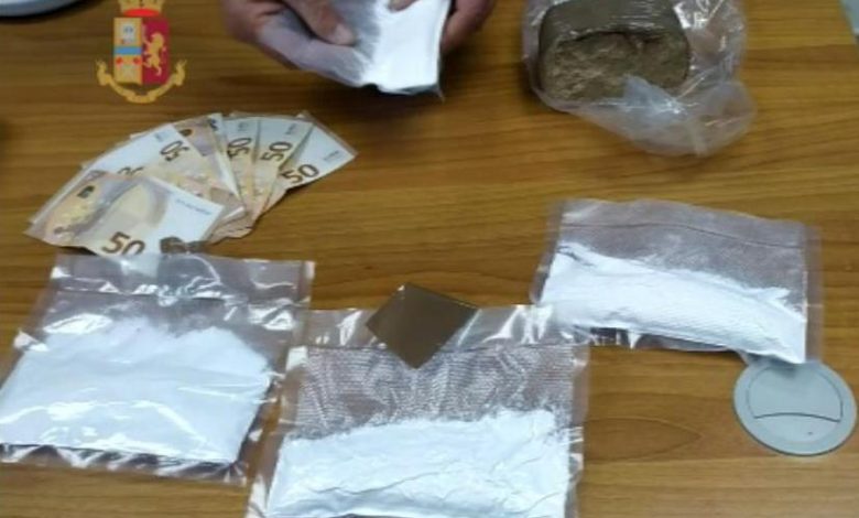 Sotto il sedile del conducente i Falchi hanno rinvenuto, all’interno di una busta di plastica, un grosso involucro sigillato da nastro adesivo da imballaggio di colore marrone, contenente 535 grammi di eroina allo stato puro e quattro confezioni sottovuoto con all’interno cocaina in polvere dal peso complessivo di 350 grammi circa.