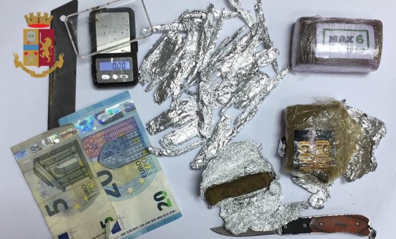 All’interno degli stessi, sono state ritrovate 32 dosi preconfezionate di “hashish” e  3 involucri della stessa sostanza stupefacente per un peso complessivo di circa 200 grammi, oltre ad un bilancino, una lama ancora intrisa di hashish, un coltello a serramanico e 25 euro in contanti.