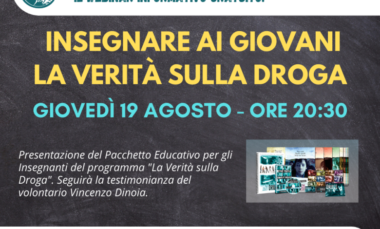 Per questo motivo i volontari terranno un webinar gratuito informativo intitolato “Insegnare ai Giovani La Verità sulla Droga” Giovedì 19 Agosto alle ore 20:30.